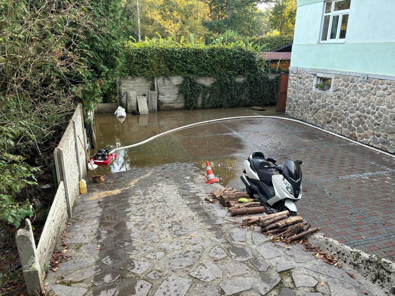 13:45 hod. - zvýšení zabezpečení domu č.p. 77 pytli s pískem - Hamr